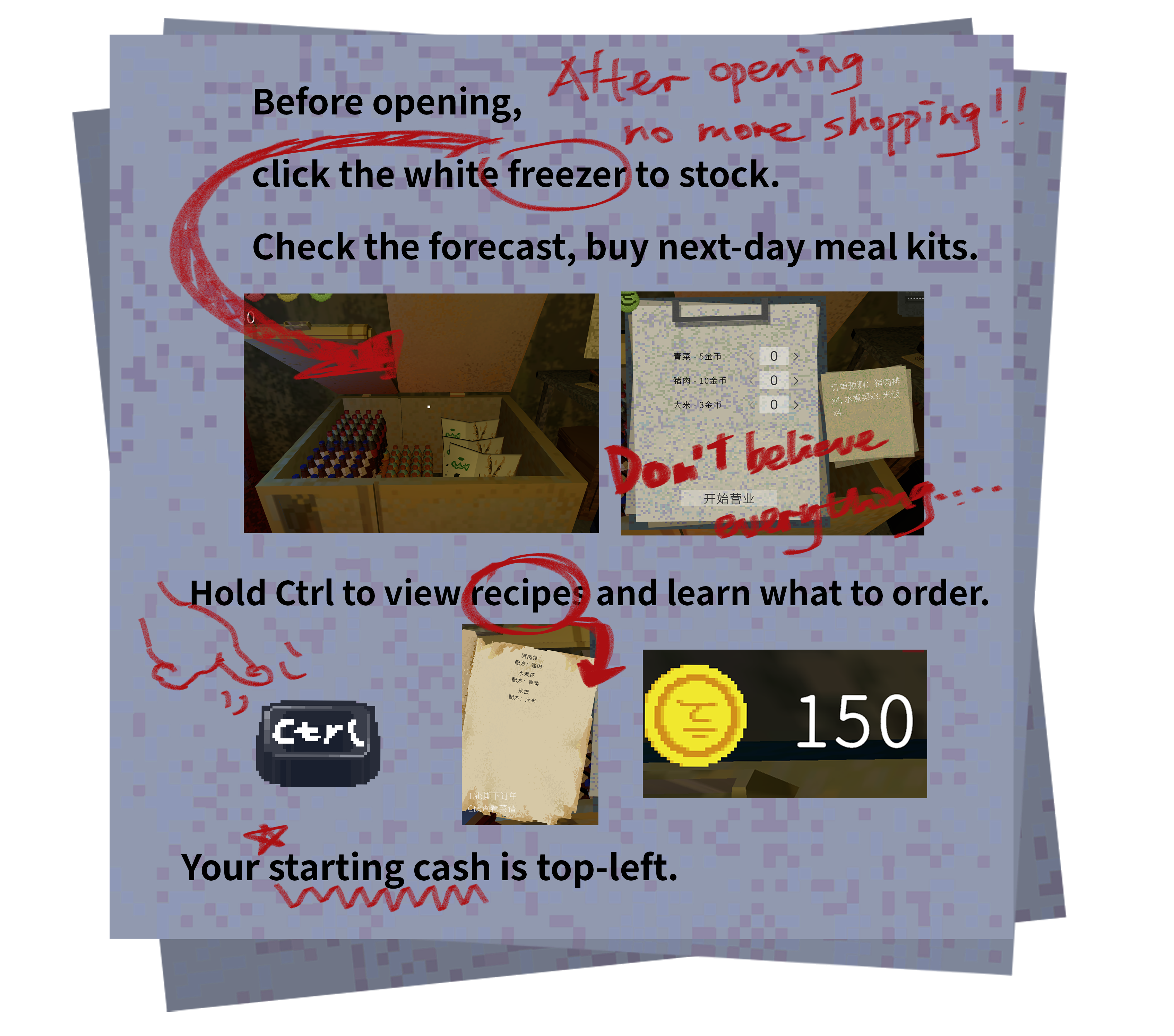 本作是一款采用3D第一人称视角的模拟经营游戏,融合资源管理与rogue-like风格玩法。游戏聚焦于一个误入歧途的小外卖作坊的故事,讲述其如何从永无止境的劳役中寻求出路。